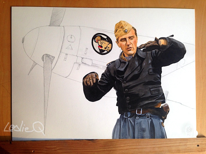 Above is an acrylic painting Luftwaffe Ace, Hans-Joachim Marseille, with the nose of a Bf-109 behind him.
