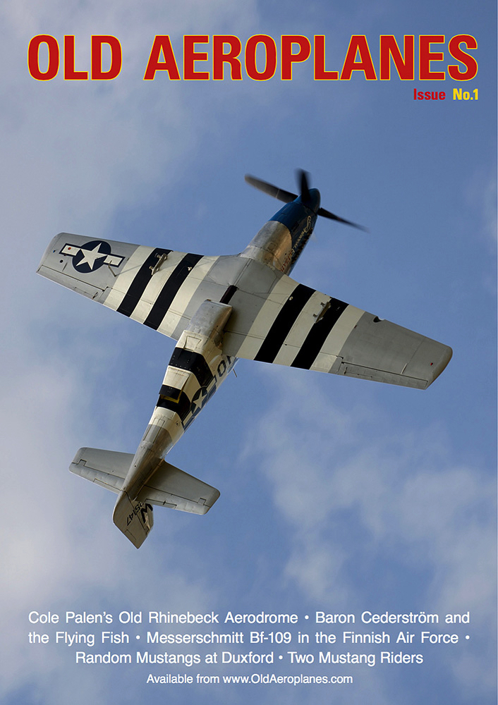 Issue number one of magazine Old Aeroplanes, contains articles about: Cole Palen’s Old Rhinebeck Aerodrome, Swedish aviation pioneer Baron Carl Cederström and his amphibian Flygfisken - Flying Fish, the Messerschmitt Bf-109 in Finnish Air Force service, a photo essay on P-51 Mustangs flown at the Imperial War Museum Duxford, and portraits of two Mustang pilots of the 8th Air Force - Frank E. Birtciel and Walter E. Hopkins.